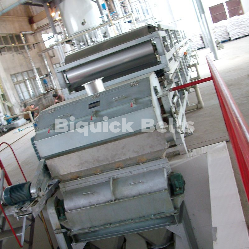 Ленточный охладитель из нержавеющей стали состоит из двойных роликов, ленточного конвейера из нержавеющей стали, дробилки хлопьевидного материала, системы водяного охлаждения и ходовой части. Термоплавкий материал, экструдированный экструдером, раскатывается валками в полосу толщиной 1-2 мм и охлаждается водой. В процессе транспортировки холодная вода распыляется на заднюю часть стальной ленты с помощью форсунок, обеспечивая равномерное распределение охлаждающей воды, что позволяет материалу равномерно охладиться до твердого состояния и разбиться на хлопья, которые попадают в бункер для материала. Охлаждающая вода не вступает в контакт с веществами в системе охлаждения. Незагрязненную охлаждающую воду можно перерабатывать или сбрасывать, не вызывая загрязнения окружающей среды.